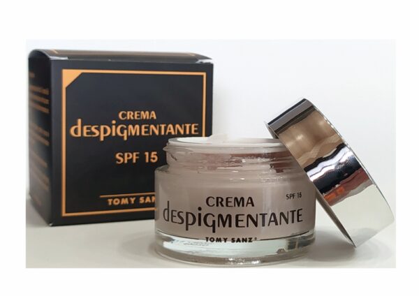 CREMA FACIAL DESPIGMENTANTE Con protección solar SPF 15. Para todo tipo de pieles. Crema despigmentante diseñada con Filtros UV +15 contra el Sol y Agentes Externos. Recomendado para pieles con Pecas, lunares o manchas provocados por la edad, desórdenes hormonales o los Rayos UV. Su fórmula regula la Melanina y controla el exceso de pigmentación. Aplicada sobre la piel, hidrata, nutre y reduce notablemente el tamaño e intensidad de las manchas. También se recomienda como crema de día para días soleados
