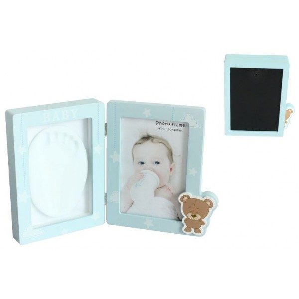 Portafotos doble con espacio para una imagen y por la otra parte contiene una masilla en la cual se puede inmortalizar la huella del bebe.